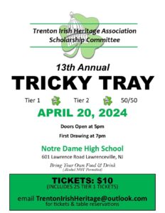 April 20 Trenton Irish Heritage Association Tricky Tray Notre Dame HS 601 Lawrence Rd Doors Open 5pm, First Drawing 7pm